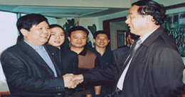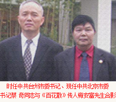 全國政協(xié)副主席、中共中央委員、中國殘聯(lián)主席鄧樸方先生與鄭州臺州商會支部書記兼秘書長、《百花散》傳人梅安富先生親切交談鄭州市腫瘤康復(fù)協(xié)會名譽會長。2005年5月,作為臺州古代中醫(yī)秘方梅氏《百花散》